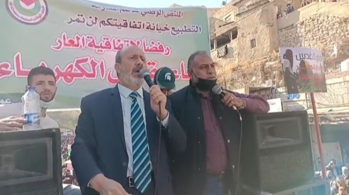 وأكد العضايلة توحد الشعب الأردني بكافة أطيافه على رفض اتفاقية التطبيع والعار، وعلى الانتصار لكرامته ومستقبله ورفض رهن مقدرات الأردن للاحتلال، مضيفاً ” لن يقبل أهل معان أن يقام على أراضيهم مشروع بيع الكهرباء للاحتلال، والشعب لن يمرر هذه الاتفاقية وسيرفضها كما رفض اتفاقية الغاز واتفاقية التعاون الدفاعي مع امريكا، فالشعب الأردني بوصلته واضحة وهو في الخندق المتقدم للدفاع عن فلسطين وشريك في معركة التحرير، فيما العدو الصهيوني اليوم يتجرأ على الأردن وسيادته وشعبه وعلى المقدسات والشعب الفلسطيني”.