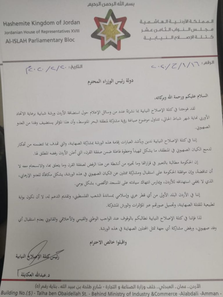 لذا فإننا في كتلة الإصلاح النيابية نطالبكم بالوقوف عند الواجب الوطني والقيمي والأخلاقي والقانوني بعدم استقبال أي وفد صهيوني، ورفض مشاركة أي جهة تمثل المحتلين الصهاينة في هذه الورشة.