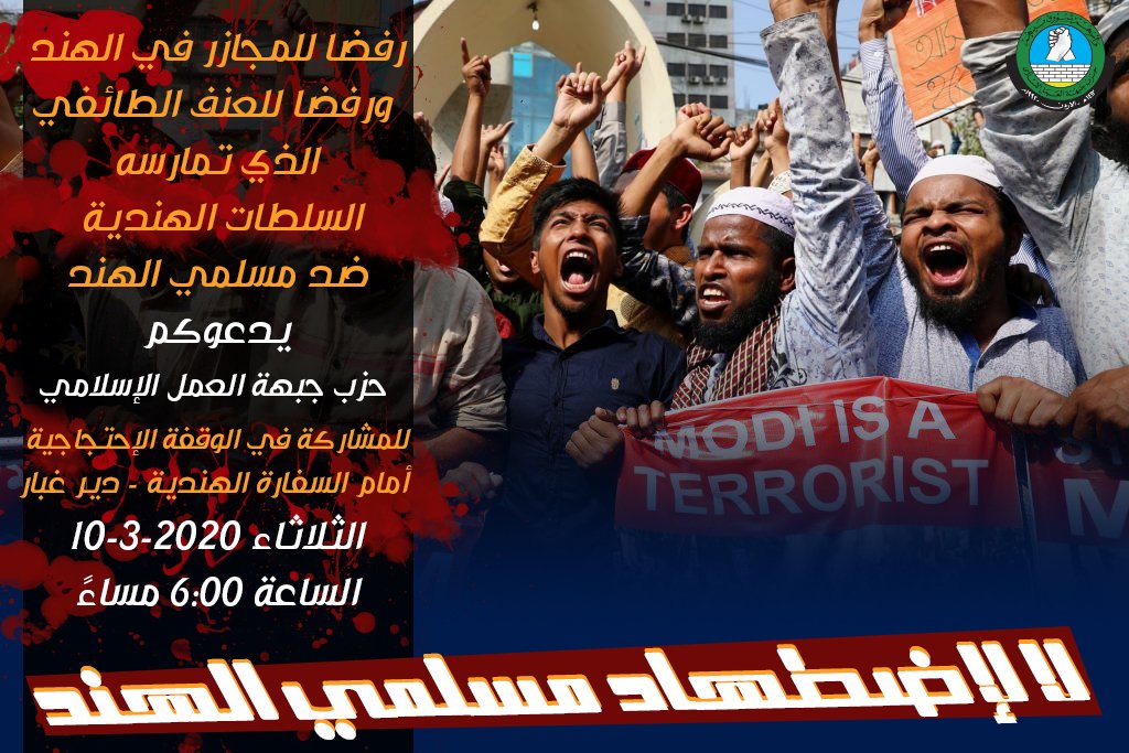 يدعوا حزب جبهة العمل الإسلامي للمشاركة في وقفة احتجاجية أمام السفارة الهندية رفضا للعنف الطائفي التي تمارسه السلطات الهندية تجاه مسلمي الهند، يوم الثلاثاء الموافق 10/3/2020 في تمام الساعة 6.00 مساءً