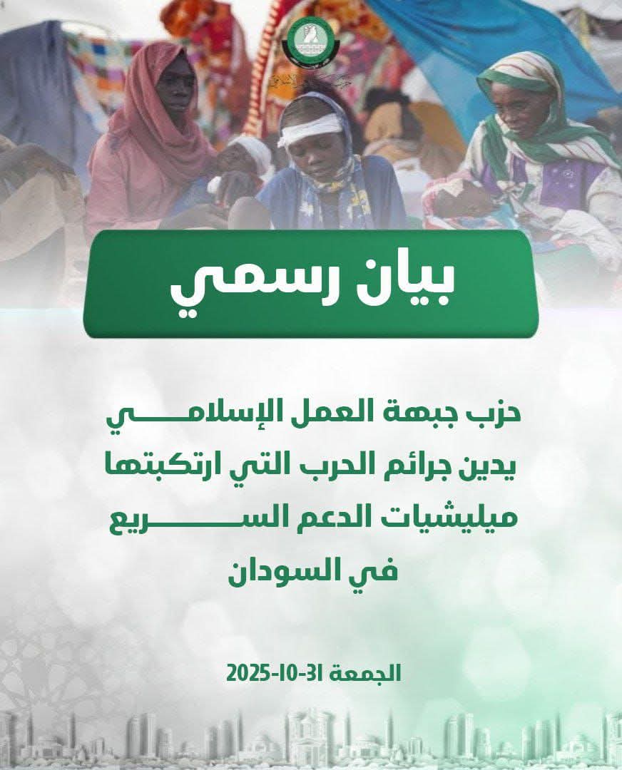 يدين حزب جبهة العمل الإسلامي جـ.ـرائم الحـ.ـرب التي ارتكبتها مليشـ.ـيات ما يسمى بقوات الدعم السريع في مدينة الفاشر غربي السودان والتي راح ضحيتها آلاف الأبرياء من الشعب السوداني الشقيق وسط صمت دولي وعربي رسمي تجاه هذه الجـ.ـرائم.