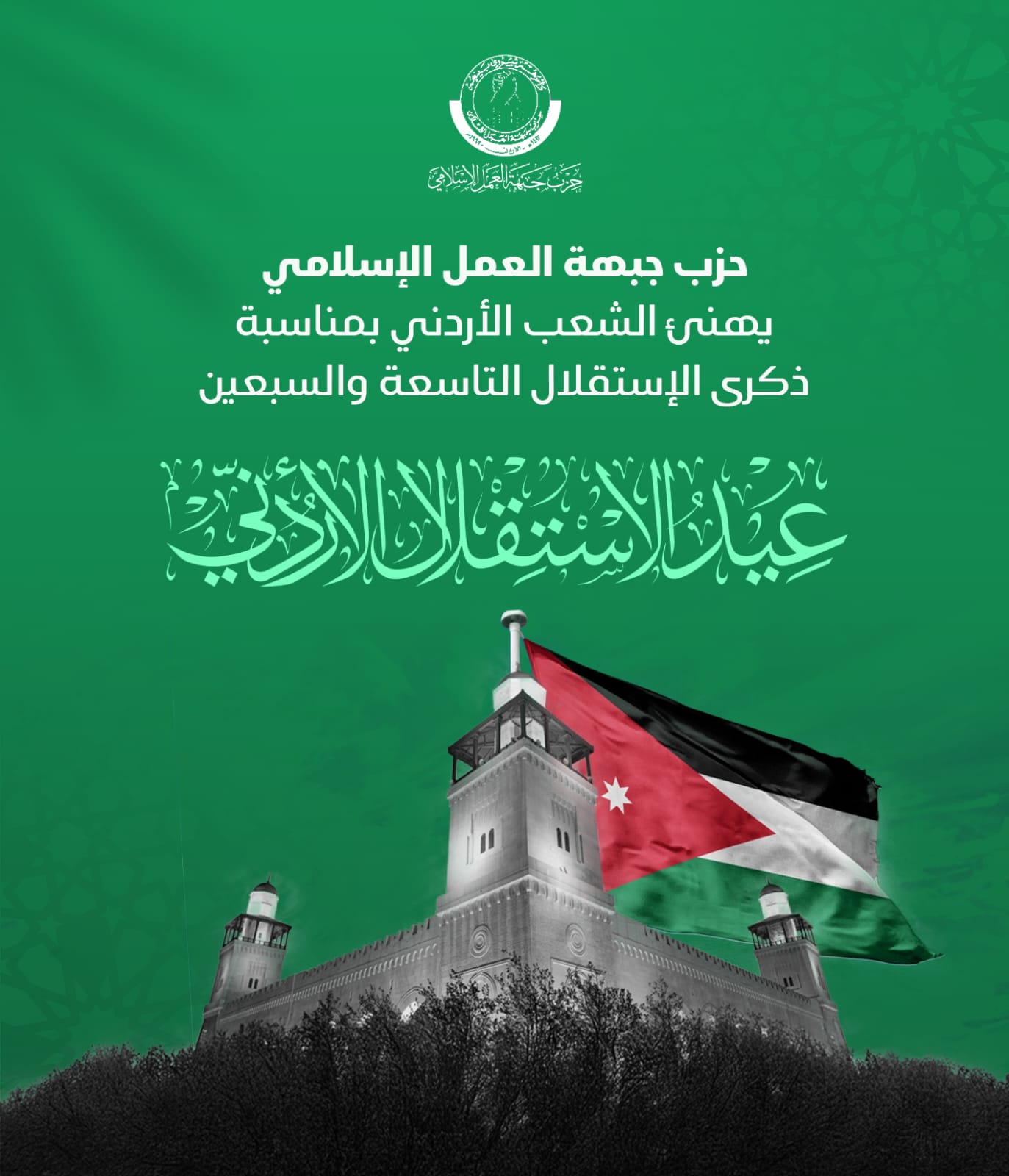 يشارك حزب جبهة العمل الاسلامي الشعب الأردني الوفي الاحتفاء بالذكرى 79 ليوم الاستقلال، هذا اليوم الذي خطه الآباء والأجداد ونشامى الجيش العربي وشهداء الأردن الذين تعطرت الأرض بدمائهم حيث بذلوا الغالي والنفيس في سبيل بناء الوطن ورفعته وحماية استقلاله وترسيخ دعائم استقراره، ولتستمر مسيرة التضحيات والاستمرار في بناء وطننا الحبيب والاستمرار في بناء الأردن وصون سيادته وأمنه واستقراره في مواجهة ما يتعرض له من تهديدات مصيرية تستهدف الشعب والدولة والنظام السياسي، وفي مقدمتها المشروع الصهيوني.