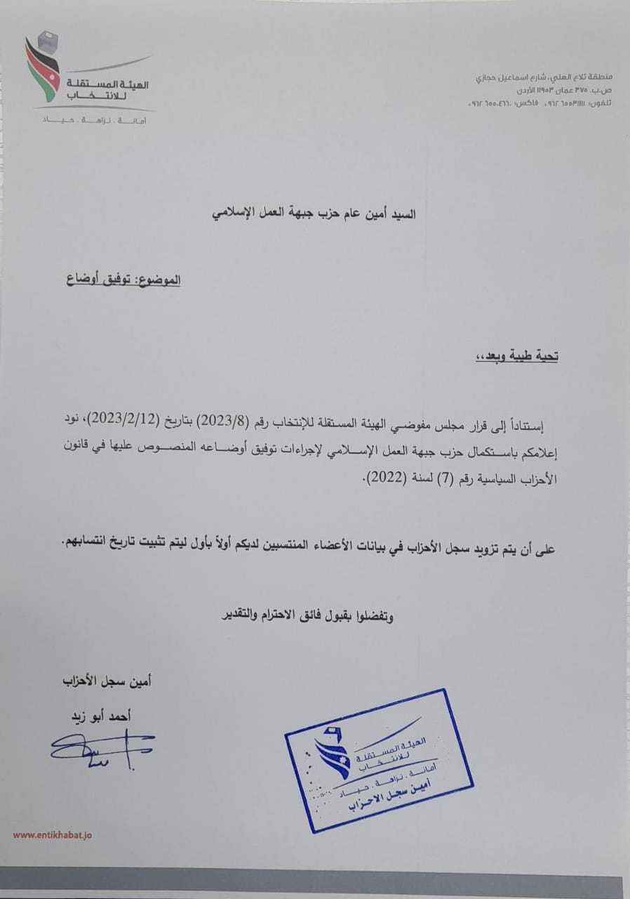 أعلنت الهيئة المستقلة للانتخاب عن استكمال حزب جبهة العمل الإسلامي لإجراءات توفيق الأوضاع وفقا لقانون الأحزاب السياسية الجديد بحسب كتاب صادر من الهيئة إلى أمين عام الحزب المهندس مراد العضايلة.