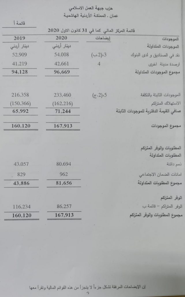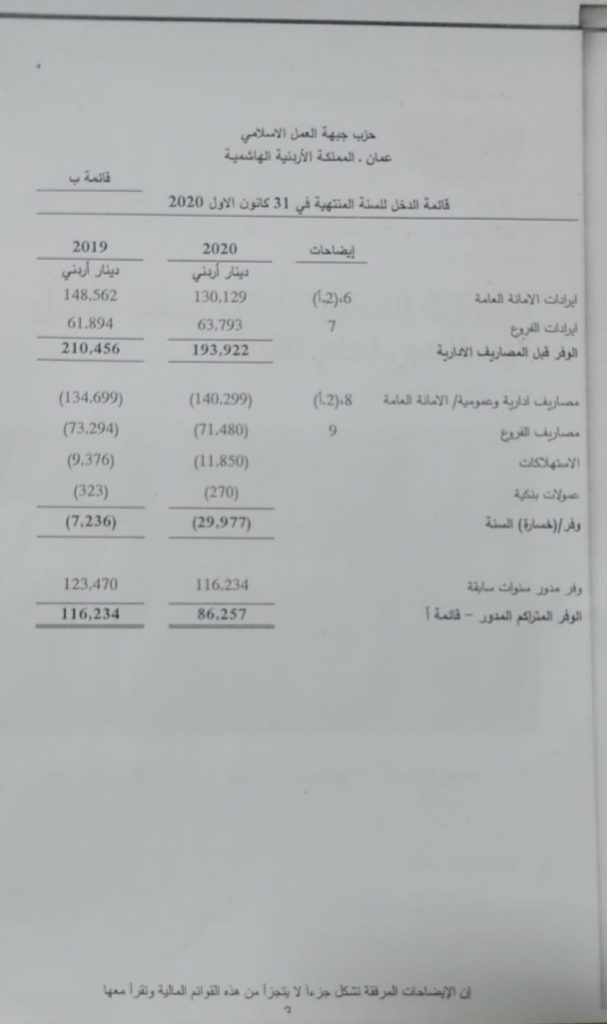 الموازنة السنوية لحزب جبهة العمل الإسلامي لعام 2020
