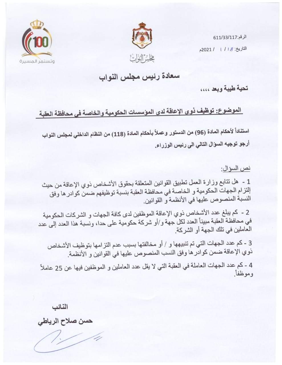 وجه النائب عن كتلة الاصلاح حسن الرياطي سؤالاً إلى الحكومة حول متابعة وزارة العمل لتطبيق القوانين المتعلقة بحقوق الأشخاص ذوي الإعاقة من حيث إلتزام الجهات الحكومية و الخاصة في محافظة العقبة بنسبة توظيفهم ضمن كوادرها وفق النسبة المنصوص عليها في الأنظمة و القوانين.