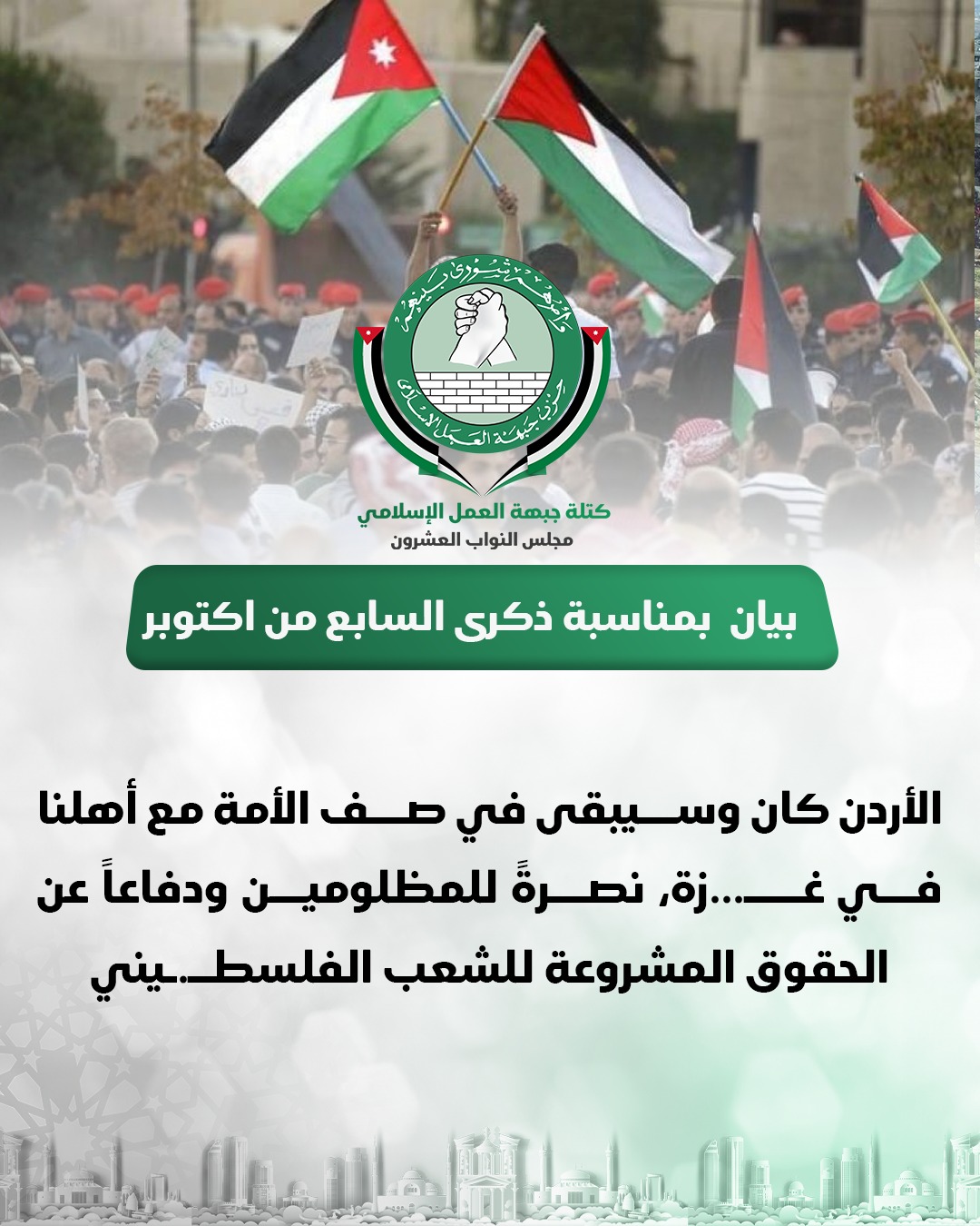 بيان صادر عن كتلة جبهة العمل الإسلامي النيابية بمناسبة ذكرى السابع من اكتوبر
