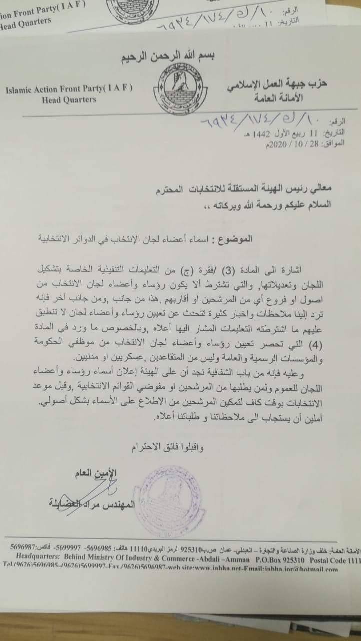 وأشار الأمين العام للحزب المهندس مراد العضايلة في مذكرتين منفصليتن موجهتين للهيئة المستقلة للانتخابات إلى ورود أنباء عن تعيين رؤساء وأعضاء لجان انتخاب على صلة قرابة بعدد من المرشحين في الدوائر الانتخابية التي ترشحوا فيها، بما يخالف تعليمات الهيئة المستقلة للانتخابات، إضافة لمخالفة الشرط المتعلق بحصر تعيين رؤساء وأعضاء الانتخابات من موظفي الحكومة والمؤسسات الرسمية والعامة وليس من المتقاعدين عسكريين أو مدنيين.