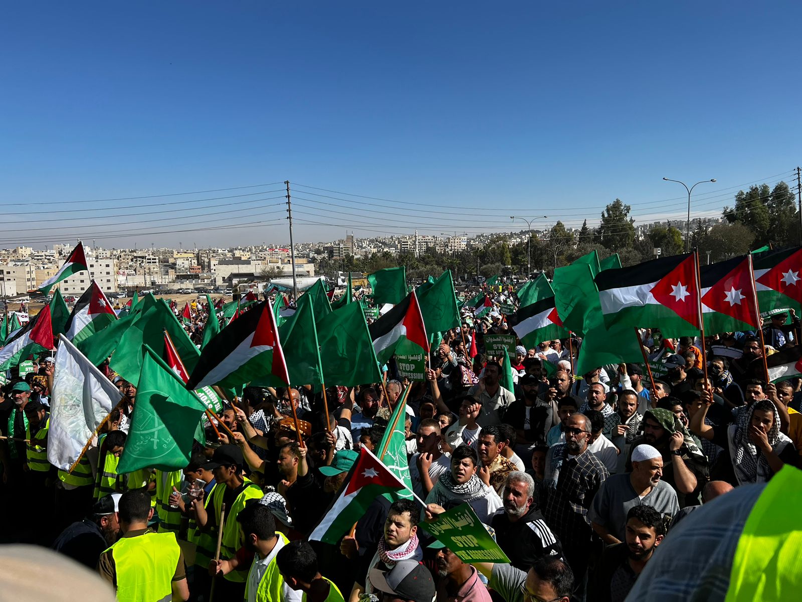 شاركت جموعٌ حاشدةٌ وكبيرة من الأردنيين، اليوم الجمعة في الفعالية التي دعت إليها الحركة الإسلامية، في منطقة جبل الزهور في العاصمة عمّان، نصرة لأهل غزة ودعما للمقاومة الباسلة ودفاعًا عن المسجد الأقصى المبارك.