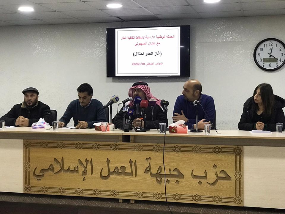 تصريحات العضايلة جاءت خلال كلمة له خلال المؤتمر الصحفي للحملة الوطنية لإسقاط اتقاقية الغاز مع الكيان الصهيوني والذي أقيم في مقر الحزب ظهر اليوم، بحضور منسق الحملة الدكتور هشام البستاني و ممثلي عدد من الأحزاب اليسارية والقومية والنقابات المهنية وأعضاء مجلس النواب والحراكات الناشطة في مجال مقاومة التطبيع.