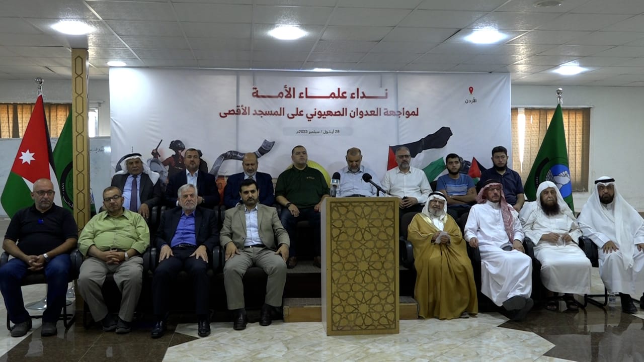 أطلقت لجنة علماء الشريعة نداء إلى علماء الأمّة لمواجهة العدوان الصهيوني على المسجد الأقصى، وذلك خلال وقفة شارك فيها عدد من علماء الشريعة مساء اليوم في مقر حزب جبهة العمل الإسلامي، بحضور الأمين العام للحزب المهندس مراد العضايلة ورئيس مجلس الشورى أحمد الزرقان والنائب محمد أبو صعيليك.