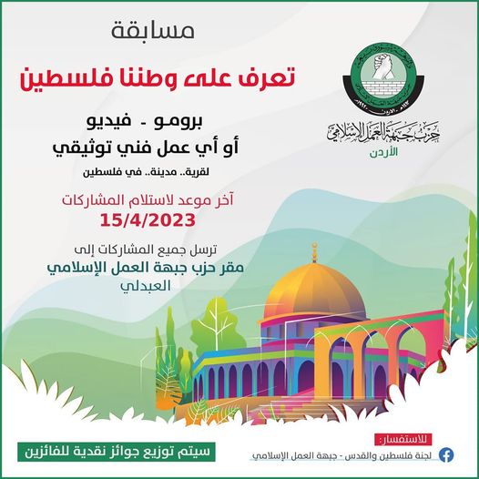 هل لديك موهبة في إنتاج عمل فني توثيقي لفلسطين (لقرية…مدينة…في فلسطين) .. مسموع أو مقروء أو مرئي شارك في مسابقة (تعرف على وطننا فلسطين)وكن أحد الفائزين في العديد من الجوائز النقدية 💰🏆🗓️آخر موعد لاستلام المشاركات 15/4/2023📍ترسل جميع المشاركات إلى: مقر حزب جبهة العمل الإسلامي-العبدلي