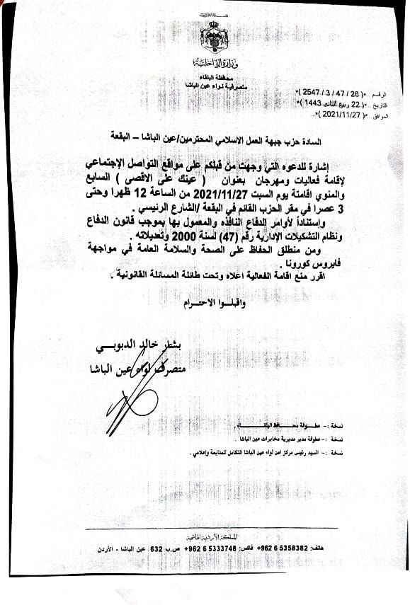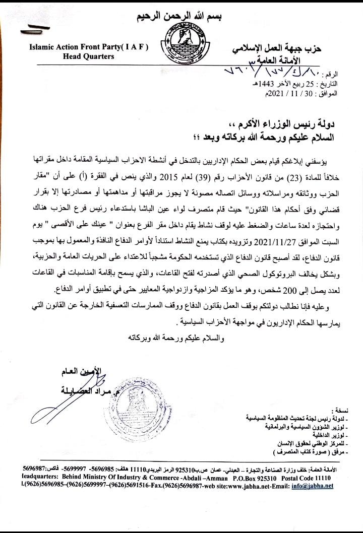 وأشار الأمين العام لحزب جبهة العمل الإسلامي المهندس مراد العضايلة في مذكرة وجهها إلى رئيس الوزراء بشر الخصاونة إلى ما قام به متصرف لواء عين الباشا من استدعاء رئيس فرع الحزب هناك واحتجازه لعدة ساعات والضغط عليه لوقف نشاط يقام داخل مقر الفرع بعنوان ” عينك على الأقصى” يوم السبت 27-11 وتزويده لكتاب يمنع النشاط استناداً لقانون الدفاع.