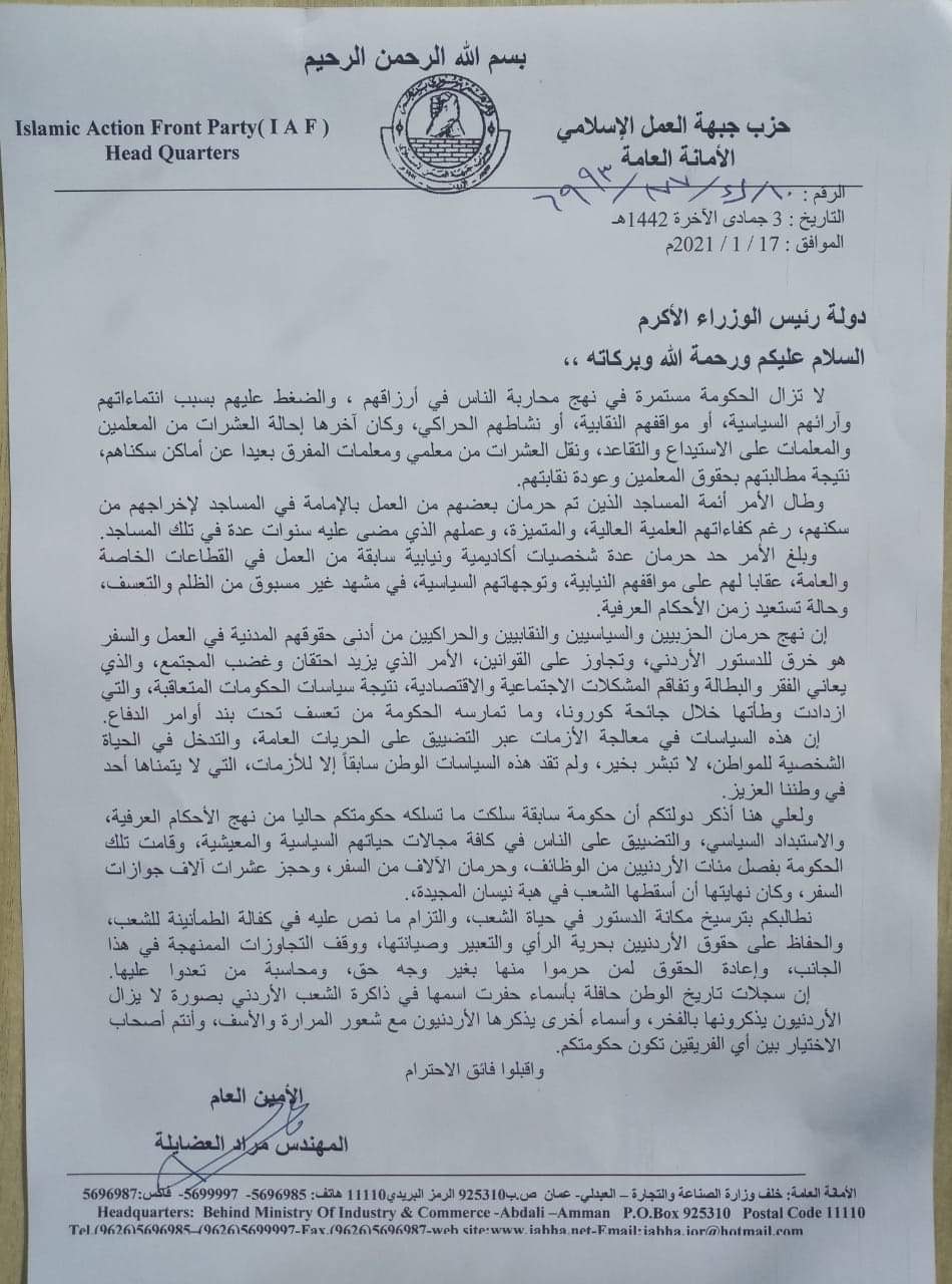 كما أشار “العمل الإسلامي” في مذكرها وجهها الأمين العام للحزب المهندس مراد العضايلة الى رئيس الوزارء بشر الخصاونة الى ما جرى من حرمان عدة شخصيات أكاديمية ونيابية سابقة من العمل في القطاعات الخاصة والعامة، عقابا لهم على مواقفهم النيابية، وتوجهاتهم السياسية، وما طال أئمة عدد من المساجد الذين تم حرمان بعضهم من العمل بالإمامة في المساجد لإخراجهم من سكنهم، رغم كفاءاتهم العلمية العالية، والمتميزة، وعملهم الذي مضى عليه سنوات عدة في تلك المساجد، في مشهد غير مسبوق من الظلم والتعسف، وحالة تستعيد زمن الأحكام العرفية” بحسب ما ورد في المذكرة.
