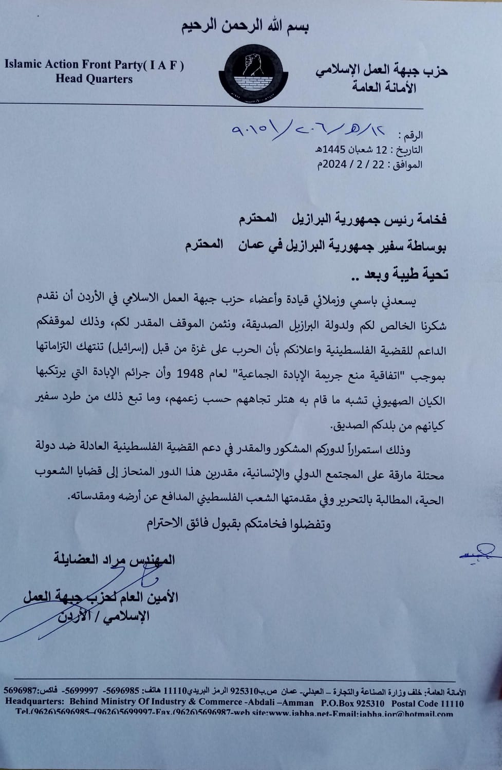 وأضاف الحزب في مذكرة وجهها الأمين العام للحزب المهندس مراد العضايلة إلى رئيس جمهورية البرازيل بوساطة السفير البرازيلي لدى الأردن “نثمن هذا الموقف المقدر لكم وذلك استمراراً لدوركم المشكور والمقدر في دعم القضية الفلسطينية العادلة ضد دولة محتلة مارقة على المجتمع الدولي والإنسانية، مقدرين هذا الدور المنحاز إلى قضايا الشعوب الحية المطالبة بالتحرير وفي مقدمتها الشعب الفلسطيني المدافع عن أرضه ومقدساتها” بحسب ما ورد في المذكرة.