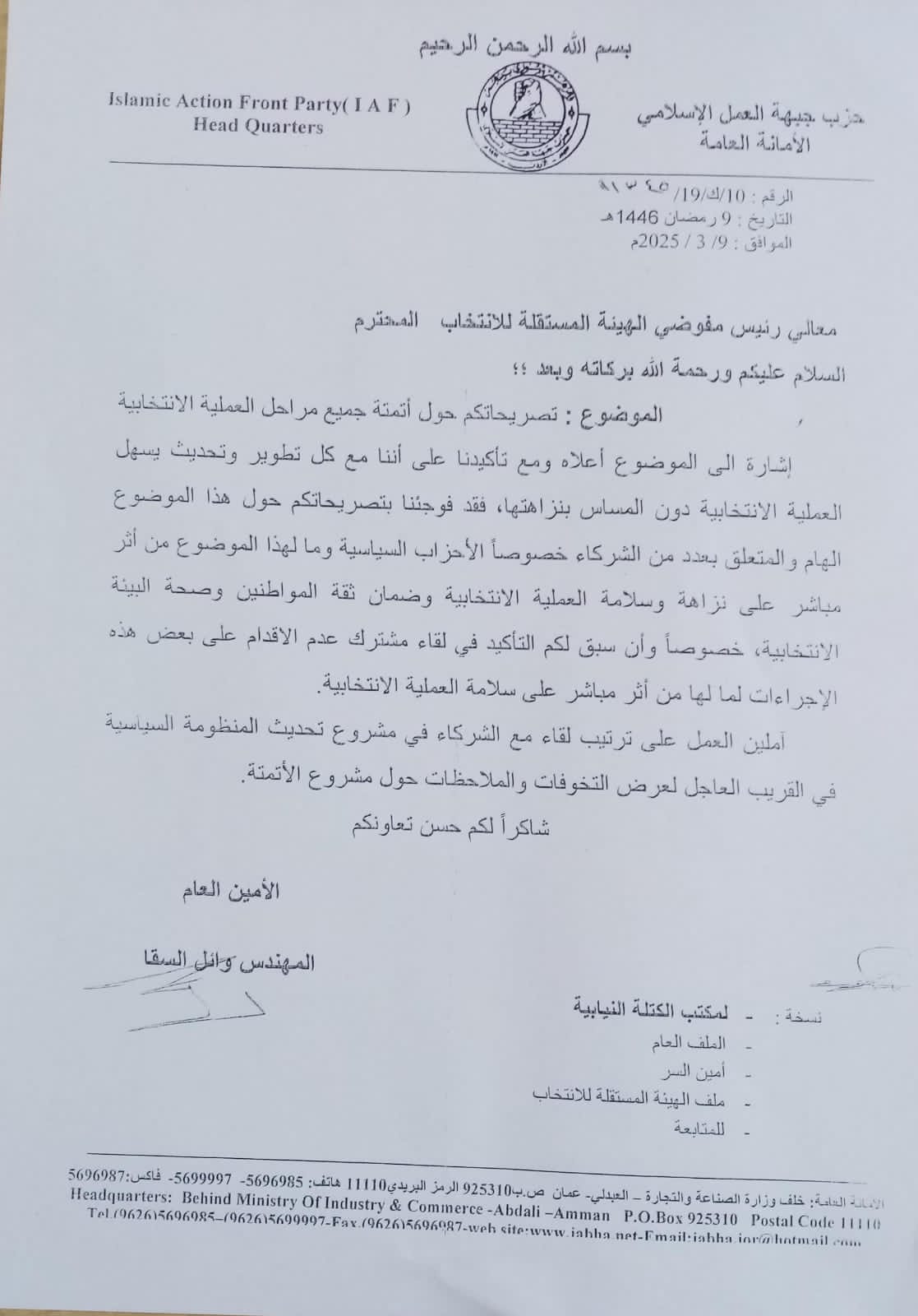 وجه حزب جبهة العمل الإسلامي مذكرة إلى رئيس مجلس مفوضي الهيئة المستقلة للانتخاب موسى المعايطة تطالبها بترتيب لقاء مع الأطراف المعنية بالعملية الانتخابية وعلى رأسها الأحزاب السياسية لعرض التخوفات والملاحظات المتعلقة بمشروع أتمتة جميع مراحل العملية الانتخابية لما لهذا القرار من أثر مباشر على نزاهة وسلامة الانتخابات وضمان ثقة المواطنين بها وصحة البيئة الانتخابية.