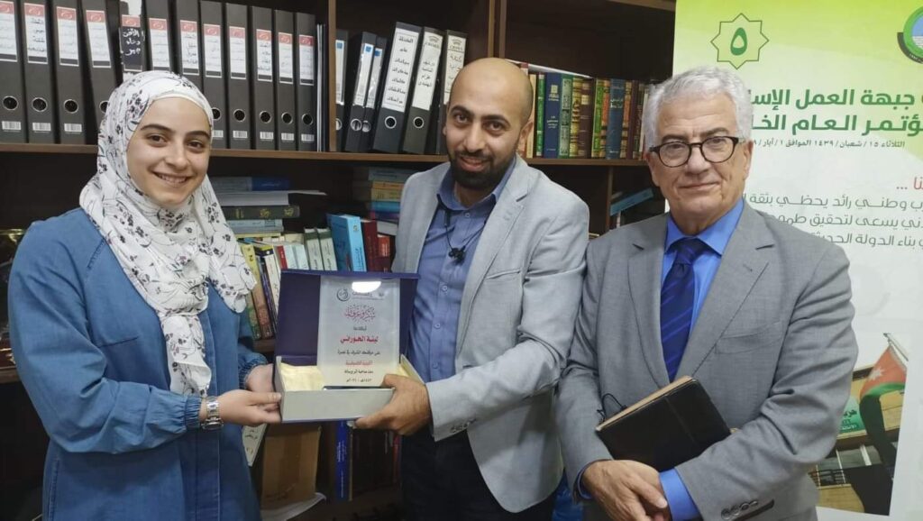 وفي ختام الندوة قام رئيس القطاع الشبابي في الحزب رياض السنيد بتكريم الطالبة الحوراني مشيدا ً بما قدمته من نموذج عن الشباب الأردني المتمسك بمبادئه والرافض للتطبيع مع العدو الصهيوني.