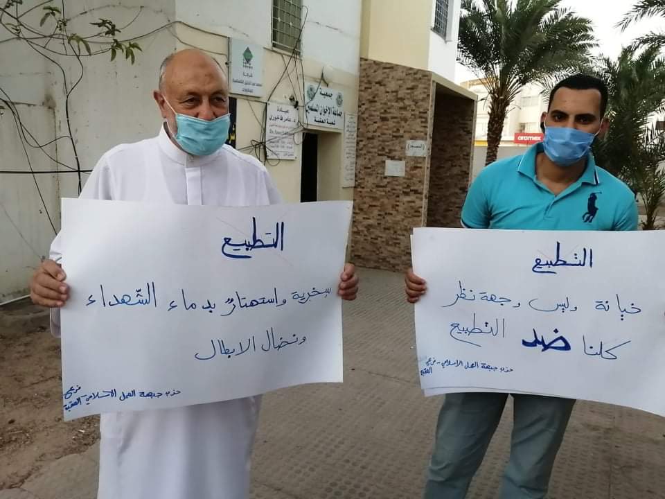 ورفع المشاركون في هذه الوقفات الاحتجاجية التي اقيمت يشكل رمزي تماشياً مع قانون الدفاع لافتات أكدت على رفض التطبيع بكافة أشكاله لما يمثله من تفريط بالقضية الفلسطينية وتنازلاً عن الأرض والمقدسات وخيانة لمواقف الشعوب التي ترى في الكيان الصهيوني العدو الأول للأمة.