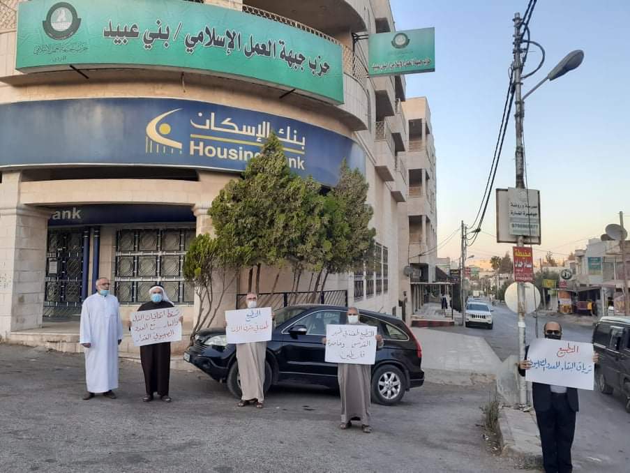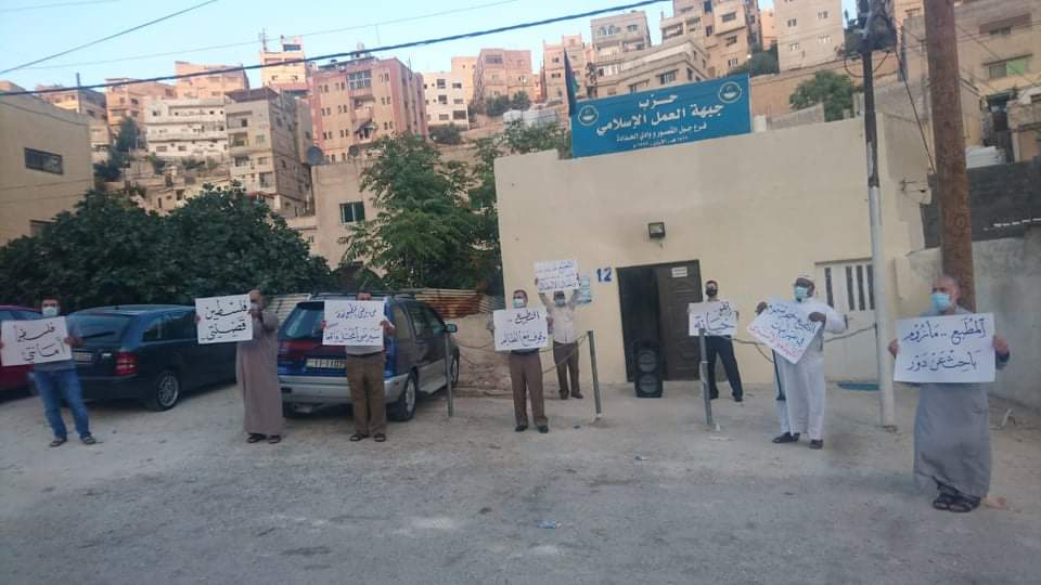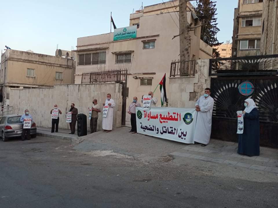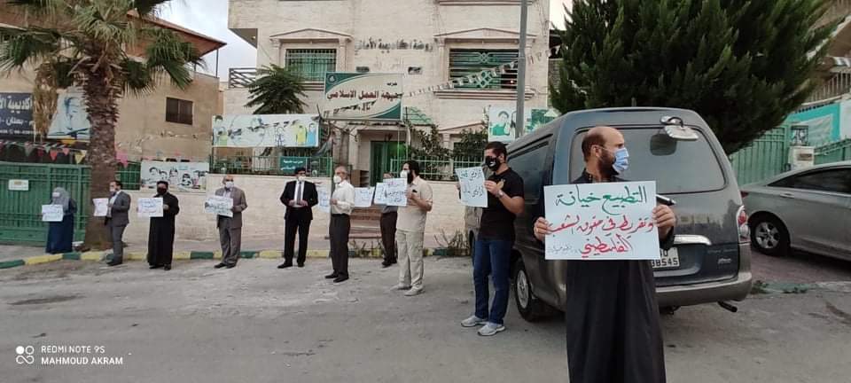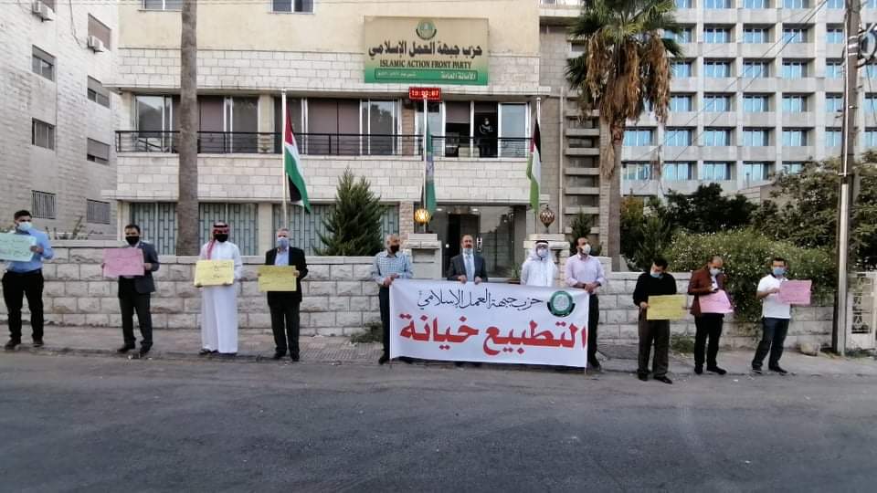 أقام حزب جبهة العمل الإسلامي المهندس وقفة احتجاجية مساء اليوم أمام مقر الأمانة العامة للحزب بالتزامن مع وقفات احتجاجية أمام جميع مقرات فروع الحزب في المملكة رفضا للتطبيع مع الكيان الصهيوني.