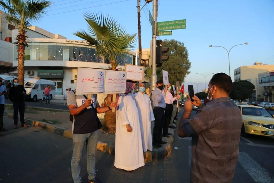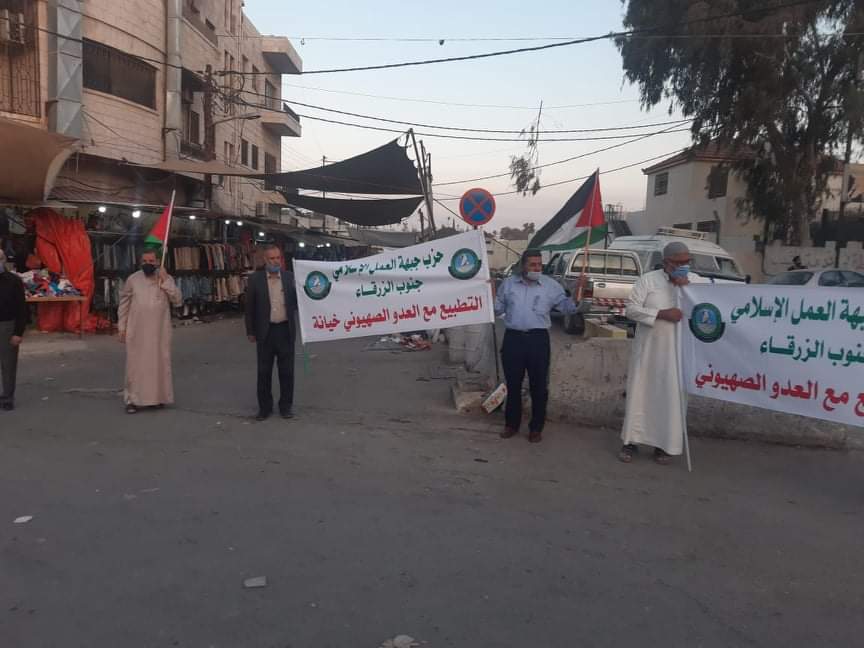 وأضاف العضايلة “هذه الوقفة التي تأتي تزامناً مع 40 وقفة في جميع فروع الحزب بالمملكة التزاماً بأمر الدفاع وبهذا الظرف الذي يمر به الوطن من وباء تأكيدا على موقف الشعب الأردني تجاه التطبيع حتى لا تمر عمليات التطبيع الخيانية للقضية الفلسطينية دون أن يكون هناك فعل شعبي على الأرض”.